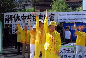 ![]() ·九·评*和法轮大法真相展板吸引路人驻足观看。 |