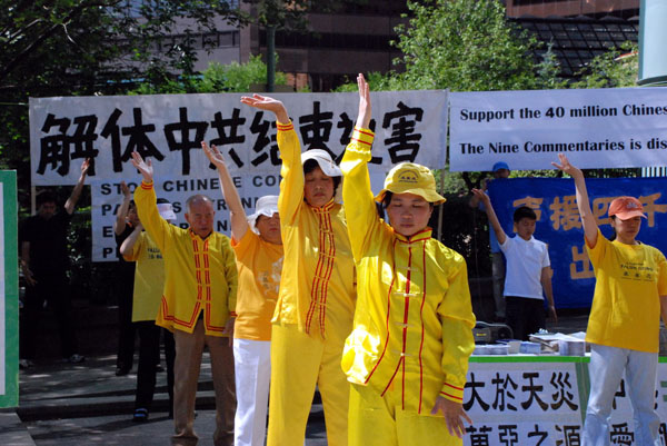 有五家媒体对此次集会进行了采访,其中包括CTV和Calgary Sun等媒体。特别是CTV对刚从大陆出来的黄女士采访时得知其在中共监狱中所受到的种种酷刑,于是进行了长时间的专访。黄女士含泪控诉了中共对她以及她的家人的迫害。几家媒体还专门对法轮功学员舒展的炼功演示做了录像。