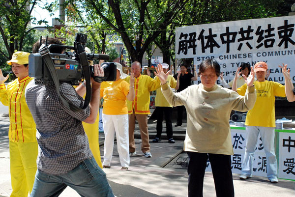 ![]() 媒体现场对法轮功学员舒展的炼功演示做了录像。 |