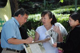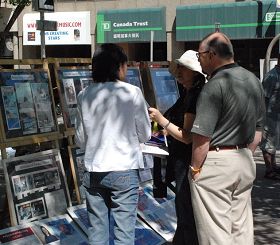 ![]() 法轮功学员向路人讲真相、征集制止迫害的签名。 |