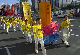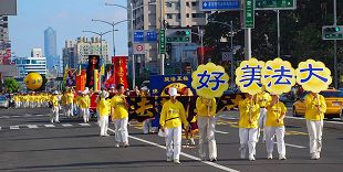 队伍中有来自屏东的曾先生夫妻,他们带着两个孩子一起来参加游行。全家修炼法轮功,亲身体验了法轮功的美好。参加了游行的两个活泼的小孩拉着大人的手说,一点也不累。
