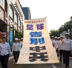 台湾法轮大法学会南区发言人郑其美先生在悼念会中表示,目前在《大.纪.元;》网站上公开声明退出中共邪恶组织的人数已经超过四千万,并且仍在加速增长中;这起因于九年前的七月二十日,以江泽民、罗干为首的中共流氓集团开始对法轮功残酷迫害,经法轮功学员不断向世人讲清真相后,已使世人了解中共邪恶本质,也因此激发了汹涌的退!党!潮。