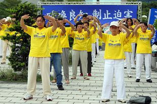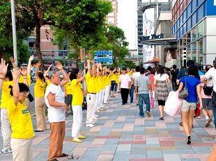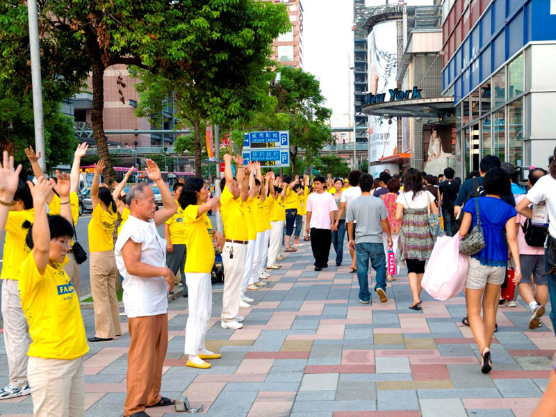 ![]() 法轮功学员在热闹的信义商区展示功法 |