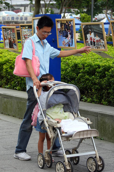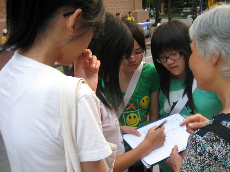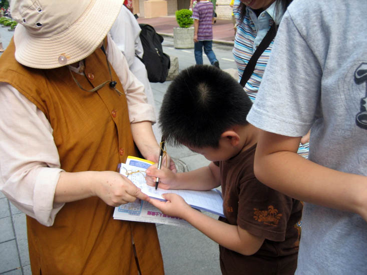 “这些人好可怜哟!”“他们为什么会被打成这样?”国小三年级的邹小妹妹轻声的问着爸爸。“这是中国共产党对不服从他们的人使用的暴力。”邹爸爸用女儿听的懂话解释着,他认为用这样的方式让台湾民众认清中共的邪恶本质是一件非常有意义的事。许多带着小孩逛街的父母,不但自己签了名,同时向小孩耐心的说明,很多小孩也以拙朴的笔迹签下他们正义的呼声。