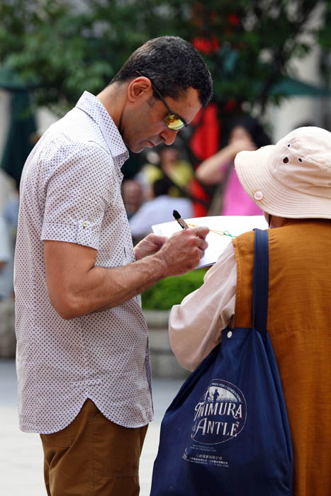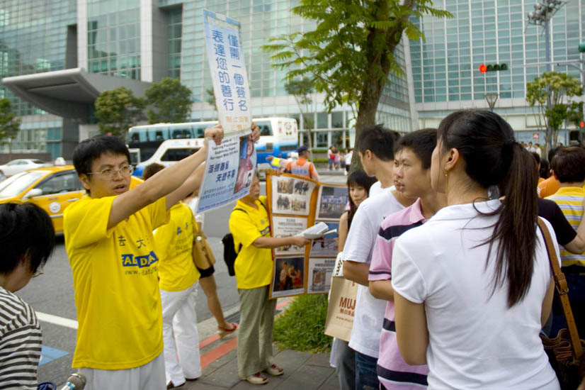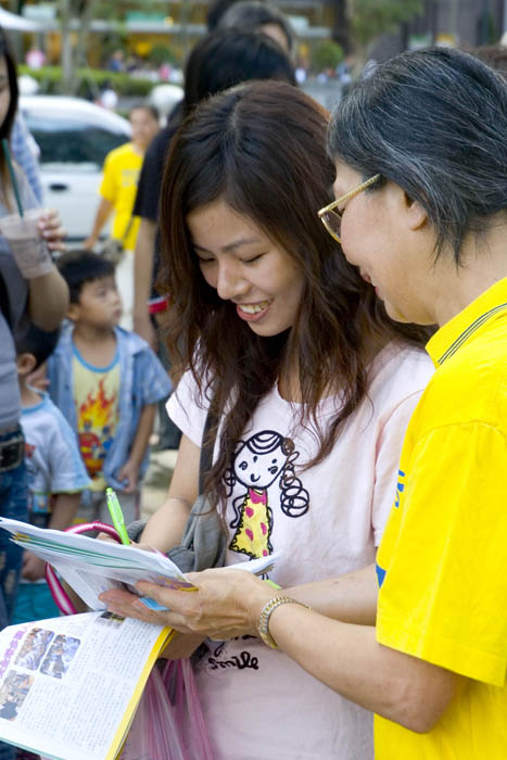 长期以来,笑容可掬的法轮功学员靠着一张嘴,几张传单,面对面的与民众接触,让许多人明白了真相。七月二十日的下午,许多法轮功学员顶着烈日,在活动的广场附近对路人讲清真相,征集联署签名共同制止迫害。