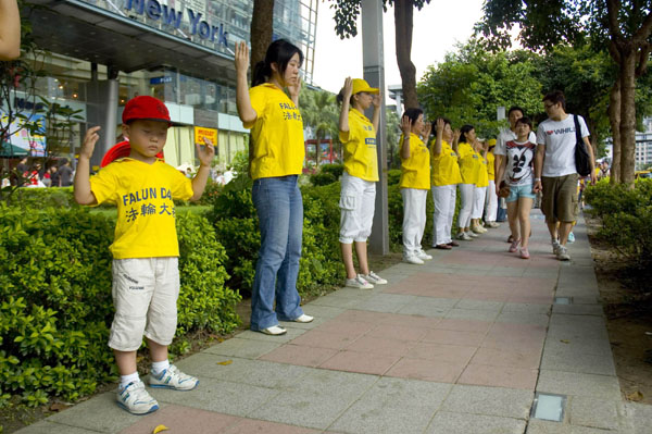 二零零八年七月二十日,一群身着写着“法轮大法好”黄衫的台湾法轮功学员,选在台北最热闹的信义商圈与世贸中心周边街道举办“七·二零”悼念活动,在松寿路、松智路、信义路五段等路段,由千人组成“功法长城”九大方阵,场面壮观浩大,绵延数公里。当炼功音乐响起,顿时将吵闹喧哗的都市带入宁静祥和的氛围,脚步匆忙的市民驻足观看,有的询问如何学炼功法,许多人在“全球反迫害百万签名”板上签名支持。