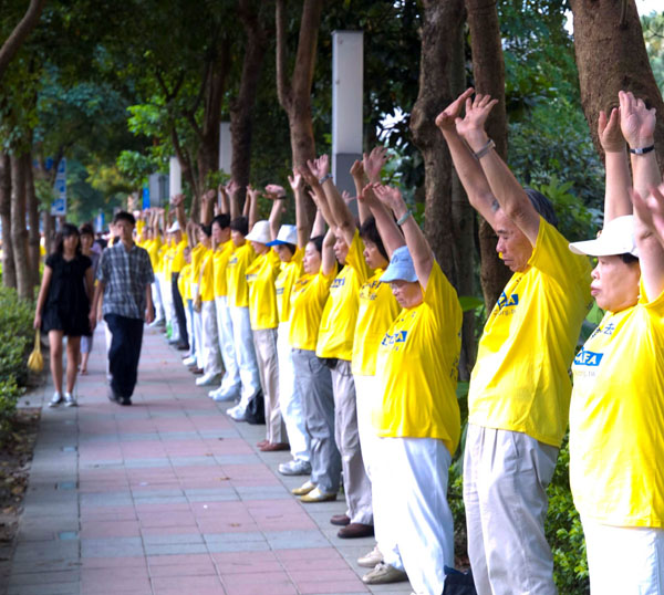 ![]() 法轮功学员在信义商圈沿路排成“功法长城”,展现法轮功功法。 |