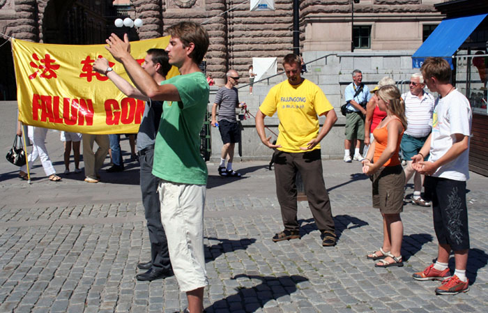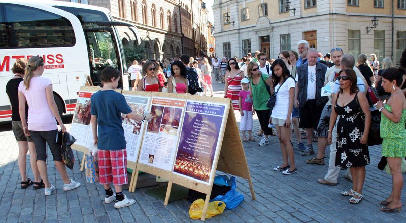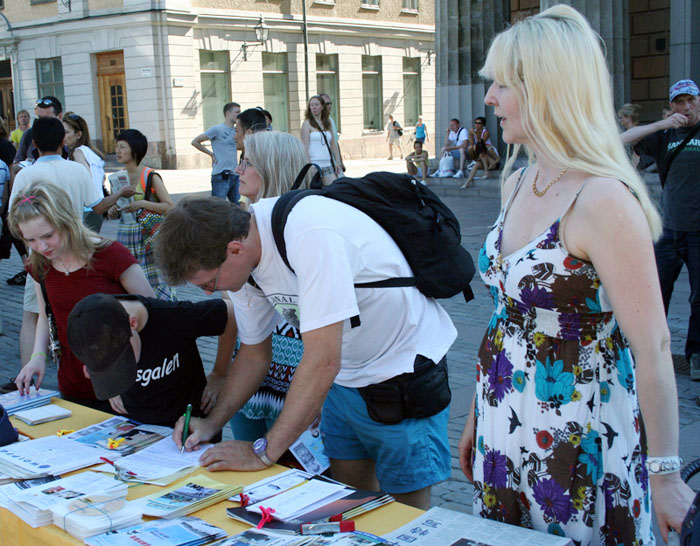 还有一对来自中国东北的老年夫妇,他们刚刚来瑞典不久,是来在这里看望读书的儿子。听着学员给他们讲中共迫害法轮功的暴行时,老人不住的点着头,“我们很相信中共是干的出这些事情来的,东北那些炼功的人被它们整的可惨了。这些人无非就是有个信仰嘛!(中共)这么做太不应该了。其实大家都知道现在国内还有不少人在炼这个(法轮功)。”