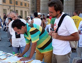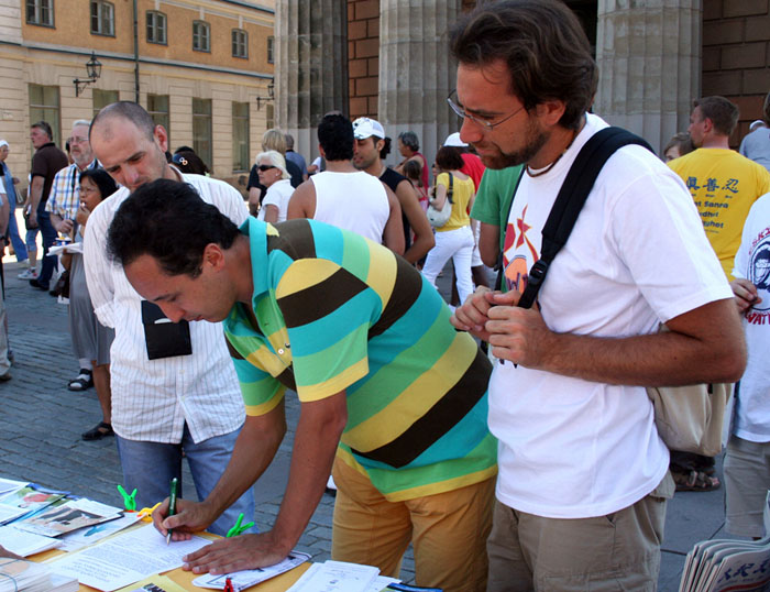 一对来自土耳其的年轻人,尽管他们在瑞典的旅游安排的很紧,但他们还是排队等着在反迫害的签字簿上签下了他们各自的名字。年轻的姑娘笑着对一位法轮功学员说:“看来我真的要开始炼法轮功了。我无论走到哪个国家都能遇到法轮功。看来这个真不是一般的功法!我回去会抓紧时间去找附近的炼功点,谢谢你们!”