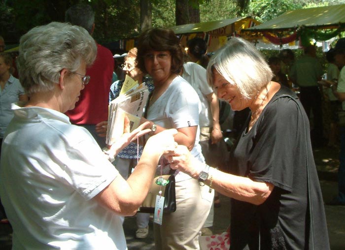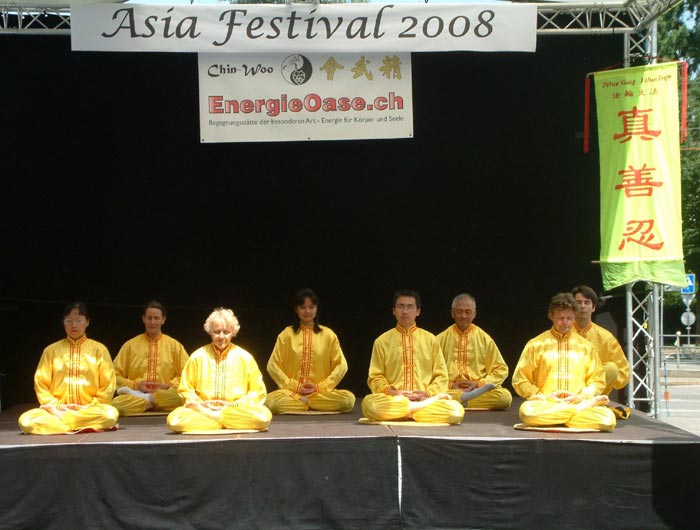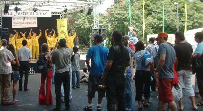 Julian女士认真的看着功法表演,“这引起了我的注意,因为他传递着一种安宁,在如此忙乱的环境中,人来人往的,还有那么多摊位,他们如此的一心一意,不为所动,这很吸引我。”在看完功法演出后,Julian女士来到法轮功的摊位前,和法轮功学员交谈了很长时间,也得知了正在中国发生的对法轮功学员的迫害,她表示无法理解为什么如此平和的人会受到如此严重的迫害。她拿了一些真相资料,特别是在伯尔尼学炼功法的地址,打算要试试学炼法轮功。