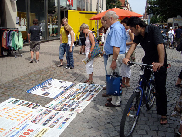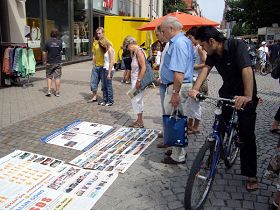 当天有华人主动来展台前了解真相,索要资料,并有当场要求“三:退.”(退出中共党、团、队)的。在商业街上有学员遇到一群中国留学生,开始,他们一听说是法轮功便回避。三言两语后,留学生们安静下来,开始注意听法轮功学员讲真相,他们脸上或现出惊愕表情、或紧锁眉头一副迷惑不解的样子。即便嘴里说“我不信”的人,也没有了一开始拒绝听真相的强烈反感情绪了。分手时,有人接受了真相资料;有人向学员友好道别;有人对学员说:“祝你们好运!”