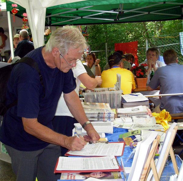 还有一位老人,在看了展板和得到的真相材料后,随即问法轮功学员是否可以签名反迫害。同时他还表示要捐钱给法轮功。学员谢绝了捐款,并告诉他法轮功是不收钱的,就连学炼法轮功也都是免费的。他马上问:“那我怎么可以帮你们呢?”“您可以把法轮功真相告诉更多的人,这就是对法轮功学员很大的帮助。”
