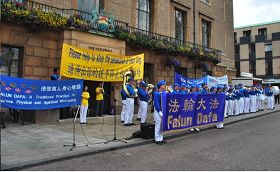 下午一时左右,大集会由天国乐团演奏“法轮大法好”开场,来自欧洲约十个国家的乐团成员们同心传递着法轮大法的美好。听到震撼人心的音乐,人们从四面八方向法轮功学员展示的真相聚拢而来。很多人看了真相展板或真相传单后,立即来到征签展台签名。在历时二个多小时的集会过程中,乐团成员反复演奏着 “法轮大法好” 、“法鼓法号震十方”、“欢乐颂”和“送宝”等四首乐曲。每次音乐响起,集会场地附近围上来的人立即明显增多。