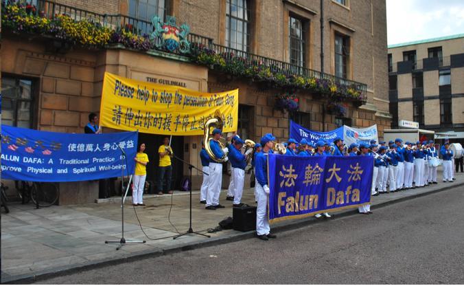 剑桥的市政厅广场范围并不大,但位于其上的露天市场非常有名,是剑桥游客的必到之地,而且在当地居民的生活中占有重要位置。每逢周末,人们往往要来这里体会剑桥小城的悠闲,在各色的食品、蔬菜、水果和工艺品摊位中寻找和满足自己的品味。而在这个星期日,法轮功学员和欧洲天国乐团的到来震撼了剑桥人和剑桥客,乐团演奏的音乐及其所携带的能量把人们的注意力引向法轮功被迫害真相。