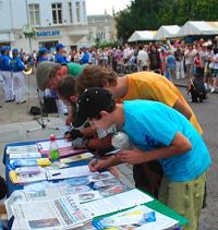 一个西人男孩儿签了名后,站在桌边不愿离去。记者上前询问,得知他是个摩洛哥人,来剑桥刚刚两星期,今天是第一次听说法轮功。记者问他为什么签名支持法轮功,他摇摇手里的真相传单说:“我还不了解这一切,但我认为支持这样被迫害的人是我该做的。”