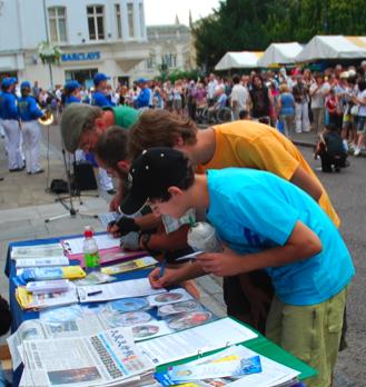 在集会进行过程中,法轮功学员一直在用真相、用音乐的力量呼唤世人的善念和良知。不断的呼唤中,世人的善念不断苏醒,走过来在反迫害征签表上签名也一直不断。