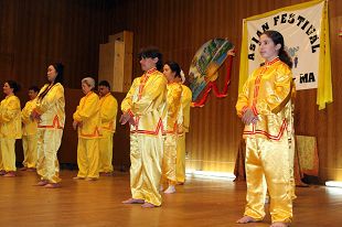 展示五套功法时,观众都以期盼的眼神静静的欣赏着学员的演示,倾听着功法介绍和法轮功真相。当学员停下解说后,功法口令和炼功音乐响彻在整个文化节的会场中。所有人都沉浸在祥和的气氛中。渐渐的,有好多人开始跟着学冲灌的动作,场面感人。
