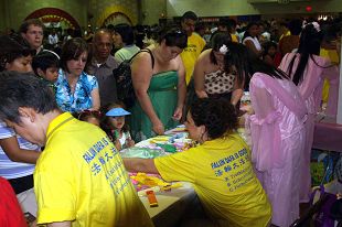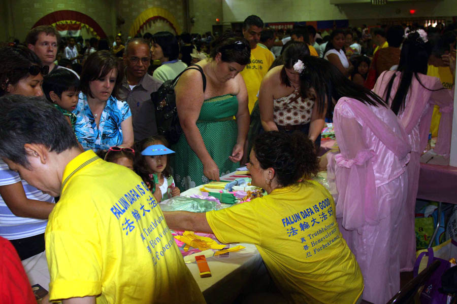 由于去年法轮功的展位非常受欢迎,今年,除了原有的展位,主办单位又免费将两边展位给了法轮功学员,以方便学折纸莲花和了解法轮功的游客。即使有三个摊位,那里还是被挤得满满的。