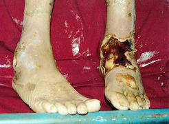 在平度看守所,恶警将钟振福戴着脚镣关在铁笼子里,指使的杀人犯大骂,逼迫他骂师父,钟振福不骂,恶徒们就打他。恶人竟用铁丝不停的抽打钟振福,打了一个多小时。这时有一好心人说这是老乡别打了,他们才住手。这时,钟振福脚已不能站立,并戴着脚镣。钟振福被迫害的脚受伤情况十分严重,出现生命危险,平度恶警将他送到医院,医生告知情况十分严重,恶警怕担责任,把其“保外就医”。钟振福在医院住了1个多月,花去1万多元,不治,于2008年7月20日离开人世。