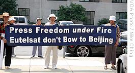 一位进行抗议的法轮功学员表示,新!唐!人:电视台、美国之音同自由亚洲电台通过欧卫的W-5卫星信号的传播已经播出了三年了。而今年六月十七号,欧卫公司切断了新!唐!人:电视台的信号,美国之音和自由亚洲电台仍然照常的播出。