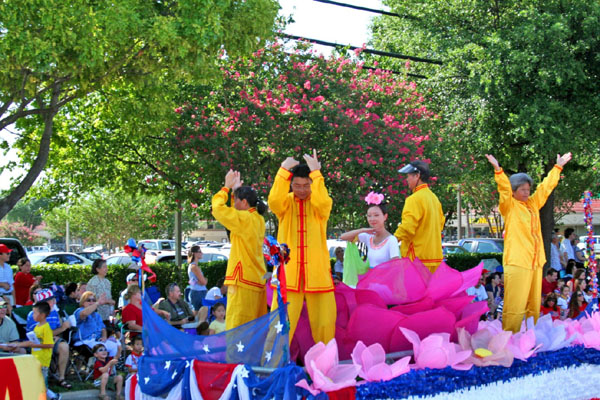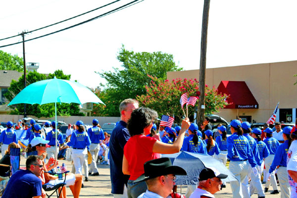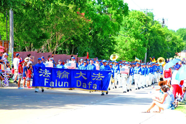 法轮功学员的队伍由德州天国乐团、法轮功功法演示、步行队伍组成,另有几名学员及小弟子在沿途向人们派发法轮功传单。优美纯净的乐曲、宁静祥和的功法、色彩鲜艳的服装,在这炎炎的夏日给布兰诺市的居民带来了祥和、美好与平静。