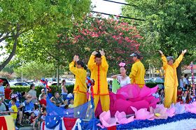 法轮功学员以红、蓝、白三色装饰了一辆美丽的花车,四名身着金黄色炼功服的学员在演示法轮功的动功,车中心巨大的粉色莲花中一名身着仙女服的女学员在演示法轮功的静功。