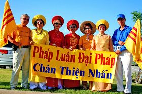 ![]() 越南裔学员举着写有越文“法轮大法”、“真、善、忍”的横幅 |