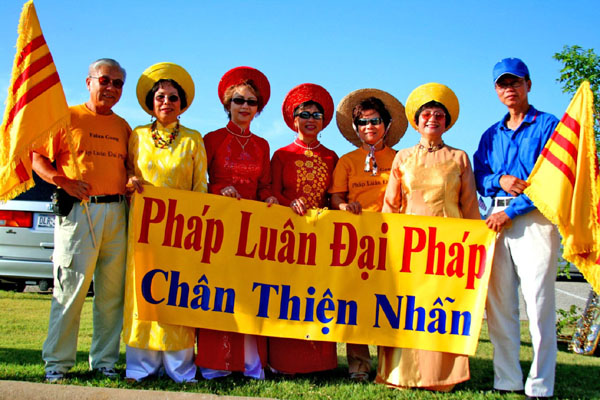 几名越南裔学员举着写有越文“法轮大法”、“真、善、忍”的横幅,女学员们身着越南传统服装,整个画面宁静、祥和。越裔大法学员Kim女士表示,他们拿越语的横幅、着越南传统服装是想让人们知道,不仅仅是中国人炼法轮功,法轮功在越裔社区也深受欢迎。