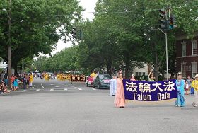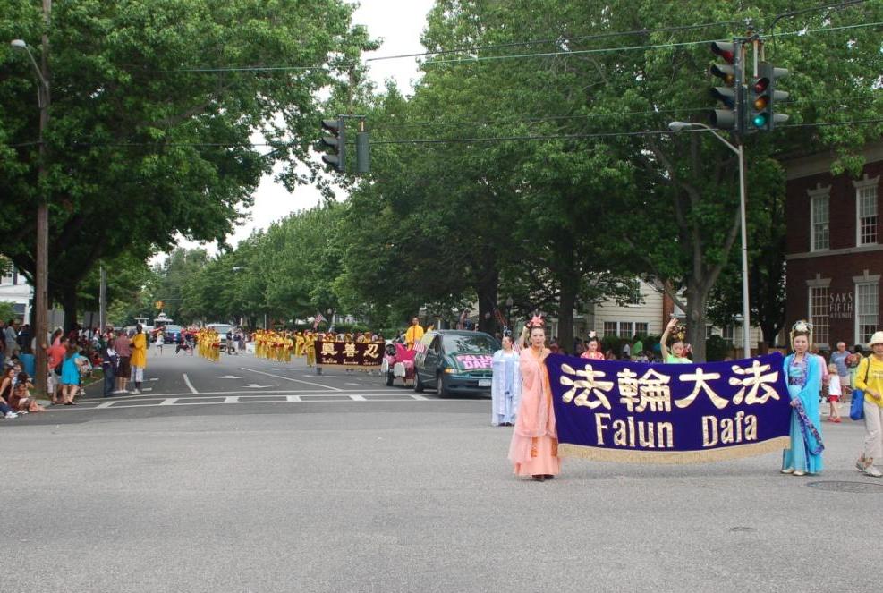 【明慧网二零零八年七月六日】二零零八年七月四日,法轮功学员参加了纽约长岛Southampton镇美国国庆游行。今年的游行历时约二个小时,有多个团体参与,包括绿色组织、动物保护协会、儿童团体、乐队等,沿途有将近两万观众观看。法轮功学员作为唯一的以华人为主的队伍参加了这次游行。