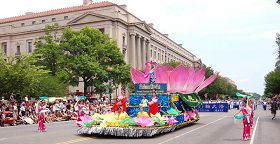 四位身着炼功服的法轮功学员手持英文的“法轮功-真善忍”横幅走在队伍的最前面,紧随其后的是精心装饰的花车,几位各族裔的法轮功学员在上面演示功法,花车顶部巨大的莲花和周围的许多小莲花象征着修炼人出淤泥而不染的品格。还有四位身着传统唐装彩带的仙女飘逸曼舞在花车两侧。