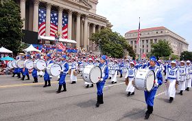 花车后面就是由一百多名法轮功学员组成的“天国乐团”军乐队,整个乐团成八路纵队,横贯整个宪法大道,声势浩荡。天国乐团演奏了《法轮大法好》、《法鼓法号震十方》、《美丽的美利坚》和《法轮圣王下世来》等乐曲。有许多观众随着天国乐团的鼓点击掌、摇摆、喝彩。