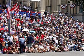 与往年独立日的酷热相比,今天的气温适中,和风宜人,好天气自然吸引了更多的美国人来观看这一年一度的庆典活动。游行的主干线是位于华盛顿市中心的宪法大道,数十万热情的观众分布在宪法大道两侧观看游行。