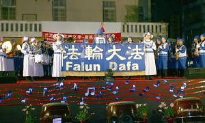 晚上七点,“唐风之夜音乐会”正式开场。“天国乐团”应邀在舞台上再度为大家演奏,嘹亮的乐音划破夏季夜空。紧接着由“新!唐!人:旗鼓队”震撼演出后,乡长花村祥在台上感谢法轮功学员为三芝乡民带来这么精彩又高水准的演出,他并表示对这庞大的演出阵容吓了一跳,想不到三芝乡能请到这么专业的艺术家们,真是太棒了。