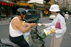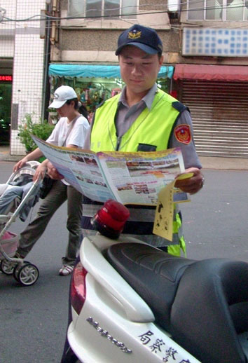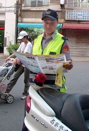![]() 领队巡警在游行结束时,立刻打开传单了解法轮大法。 |