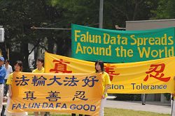 ![]() 法轮功学员在集会上的展示的横幅 |