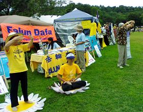 文化节期间也遇到一些中国人。第四天中午就来了一个中国旅游团,全部是夏令营的中小学生。法轮功学员拿了各式各样的资料,刚发了没几个人,领队的一个小伙子就过来阻止,那些孩子也都不敢接资料了。后来学生三五成群的散掉了,学员们就小范围的给他们讲真相,让他们珍惜这次出国的机会,多了解一些在中国看不到的真相,让他们多思考:为什么法轮功被中共说成是×教,而在外国却广受欢迎呢?为什么你们的领队不让你们接真相资料?不就是想隐瞒些什么吗。有的孩子询问了一些心中不解的问题,然后默默的接了资料。
