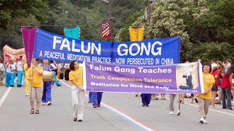 法轮大法游行方阵以紫色和蓝色的横幅为头阵,告诉观众“法轮功是一种对身心有助,教导真、善、忍为原则的功法”,“法轮功是一种和平的功法,但在中国却遭受迫害”。接下来是四名男子唐鼓手,后面三名男学员手举“真、善、忍”竖旗。随着另一阵锣鼓声,一条十几米长的鲜艳的,由九名壮汉举着的巨龙,如蛟龙戏水,时急时缓,变换着各种姿势吸引着观众的视线,欢呼声鼓掌声不断。