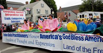 那与众不同的一动一静,一阳刚一阴柔的龙舞、花仙舞,给人们留下深深的触动,主席台上的大喇叭里响起:“用真、善、忍庆祝美国独立节!”