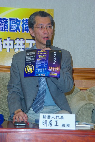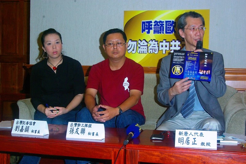 ![]() 台湾记者协会、台湾劳工阵线、多位台商和中国民运人士共同于二零零八年七月三十日召开记者会,谴责欧卫屈从中共,停播新!唐!人: |