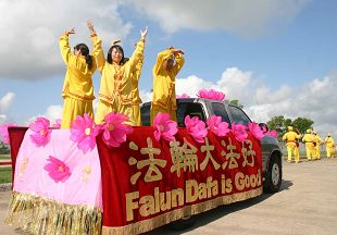 法轮功队伍包括横幅“法轮大法─真、善、忍”、鼓队、展示功法的花车,风格独特,格外醒目。当经过主席台时,主办者赞赏:“法轮功就是好(Falun Gong is good)。”观看者向学员频频招手,有些举着照相机,拍下这美好的一幕。法轮功学员则将真相资料分送给观众们。