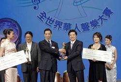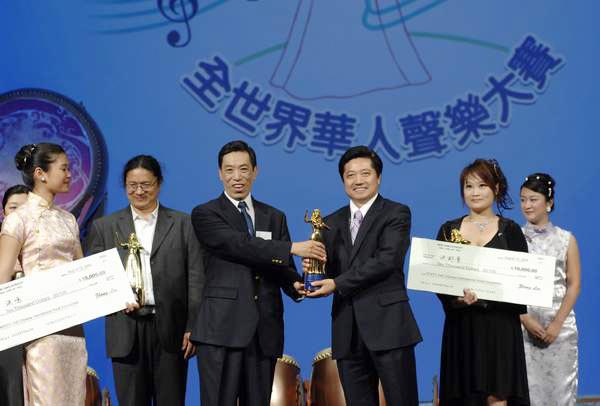 ![]() 美声男子组金奖洪鸣、美声女子组金奖洪郁菁从评委手中接过奖项 |