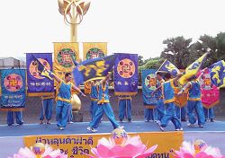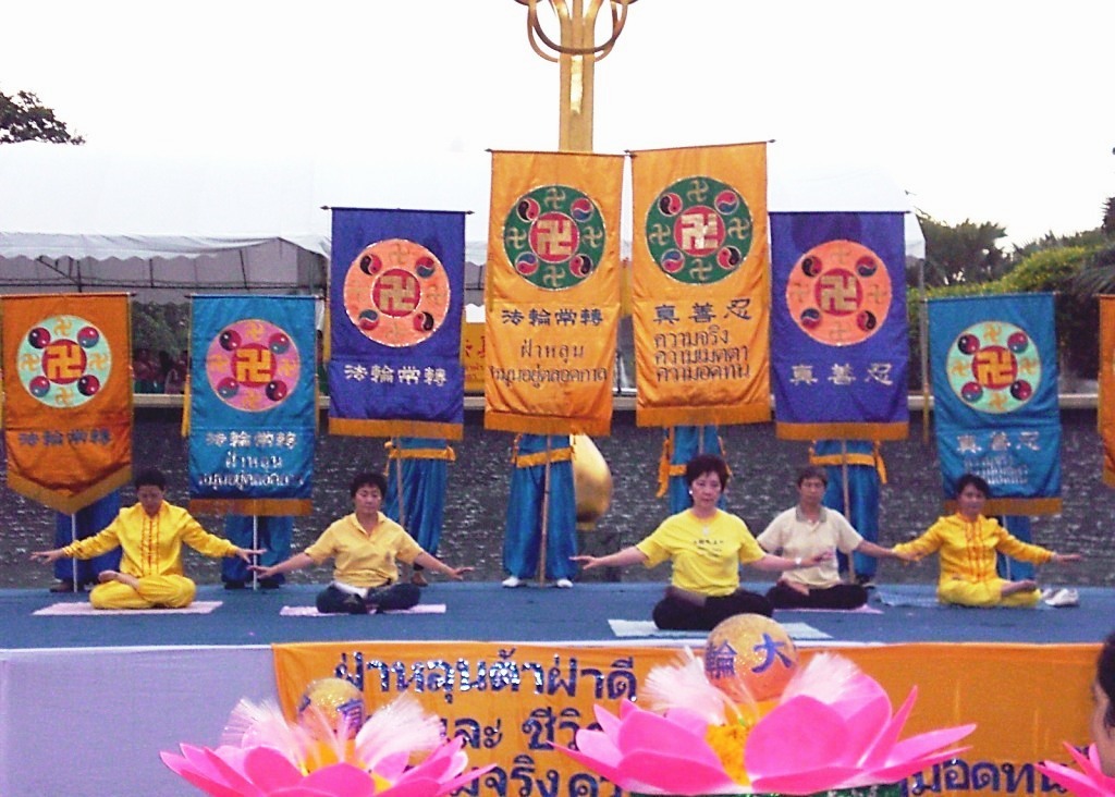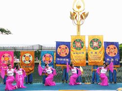 法轮功学员用彩球、“法轮大法好”横幅、粉色大莲花装饰着舞台,喜庆的鼓声和悠扬的音乐在四周飘荡。演出以热闹的舞龙旗和腰鼓开场,接着表演了仙女舞、傣族舞、荷花舞,以及「思故国」等歌曲,动听的音乐,婀娜的舞姿,优美的歌声,传向四面八方。
