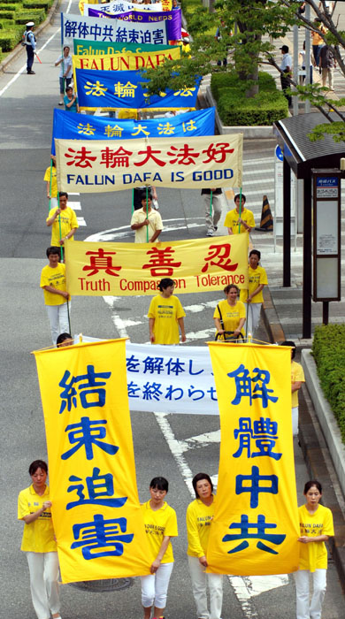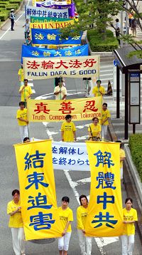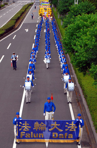 游行队伍由幕张海滨公园出发,最前面是天国乐团,紧接着是身着仙女服的明慧学校的孩子们,随后是写有“解体中共 结束迫害”、“法轮大法洪传世界”和“法轮大法好”“真、善、忍”等字样的各种中日文横幅。
