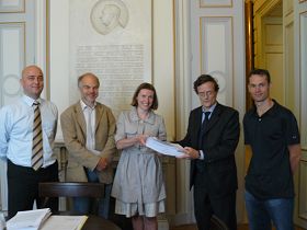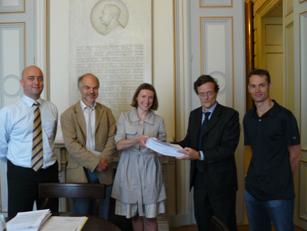![]() 联合调查团代表向比利时首相递交全球百万签名。图右起,比利时首相的新闻发言人多梅尼克•德哈纳先生、首相的外交政治顾问万桑•候修先生、真相联合调查团比利时代表尼娜•鲁吉斯特女士、比利时参议员派崔克•万可润可斯文先生、比利时法轮大法协会代表玛提亚斯•斯拉思先生。(图片来源: CIPFG) |