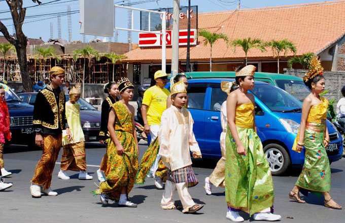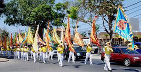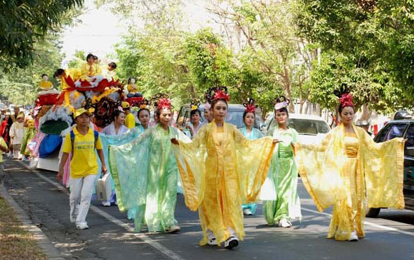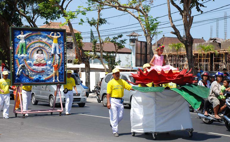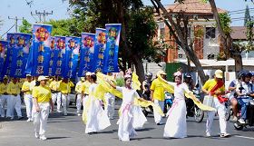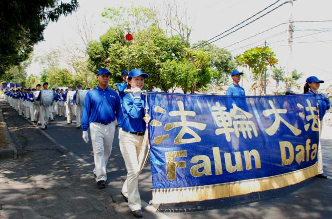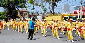 队伍从Renon广场出发,行进在登巴刹最繁华的街道上,最后到达市政府大厦前。天国乐团、炼功演示队、腰鼓队、旗帜队、花车、仙女队,还有身穿民族服装的印尼法轮功学员,多姿多彩的队伍展现着法轮功修炼者良好的精神风貌,吸引了沿途路人的关注。