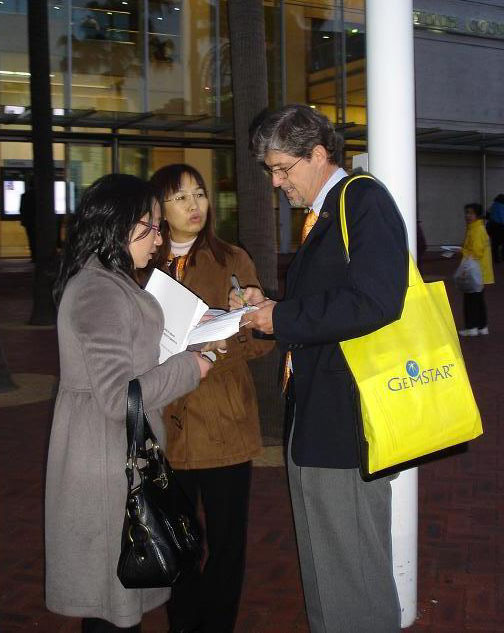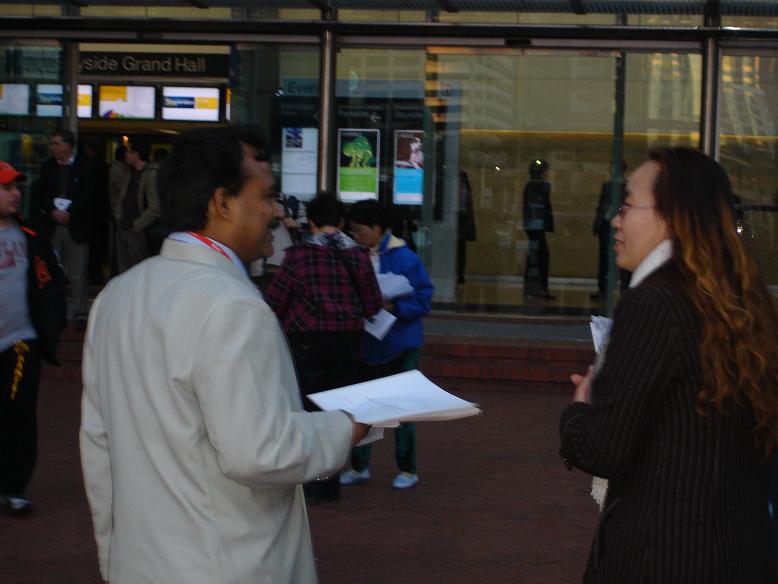 ![]() 法轮功学员在国际器官移植大会期间向各国医界学者讲真相 |