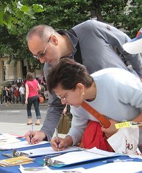 来伦敦观光的意大利游客一家三口人接过传单后并没有马上停下他们的脚步,但真相展板吸引了他们的目光。看了一会儿后,丈夫马上领着妻子和小学生模样的儿子,回头走到桌子前签名。旁边的学员向这家人表示感谢,才发现他们不太会说英语,但妻子努力说了一句“中国需要改变(China needs change)”。