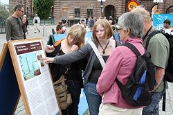 还有两位中年人,他们是从欧洲一个小国家来瑞典旅游的,能讲英语。了解了真相后,那个头戴礼帽的男士不顾自己背着很重的行李,将所有的英语真相资料、光盘都要了一份,随后签字支持法轮功。当他一抬头,看到他的同伴因为急着赶路已经走了的时候,他急了,大声喊着同伴的名字让他回来签字。同伴回来签好字后,二人才满意的离开。