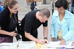 在签名反迫害的桌子旁总是围着一些人,他们很耐心的等着在呼吁制止中共迫害法轮功的征签簿上签下自己的名字,以表达支持正义的意愿,谴责中共的暴行。