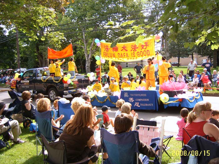 【明慧网二零零八年八月十九日】二零零八年八月十五日,加拿大法轮功学员应邀参加了爱德华王子岛首府夏洛特镇市(Charlottetown, P.E.I.)一年一度的金杯游行。在长达一个小时的游行过程中,法轮功学员精美的花车和祥和的风貌备受瞩目。